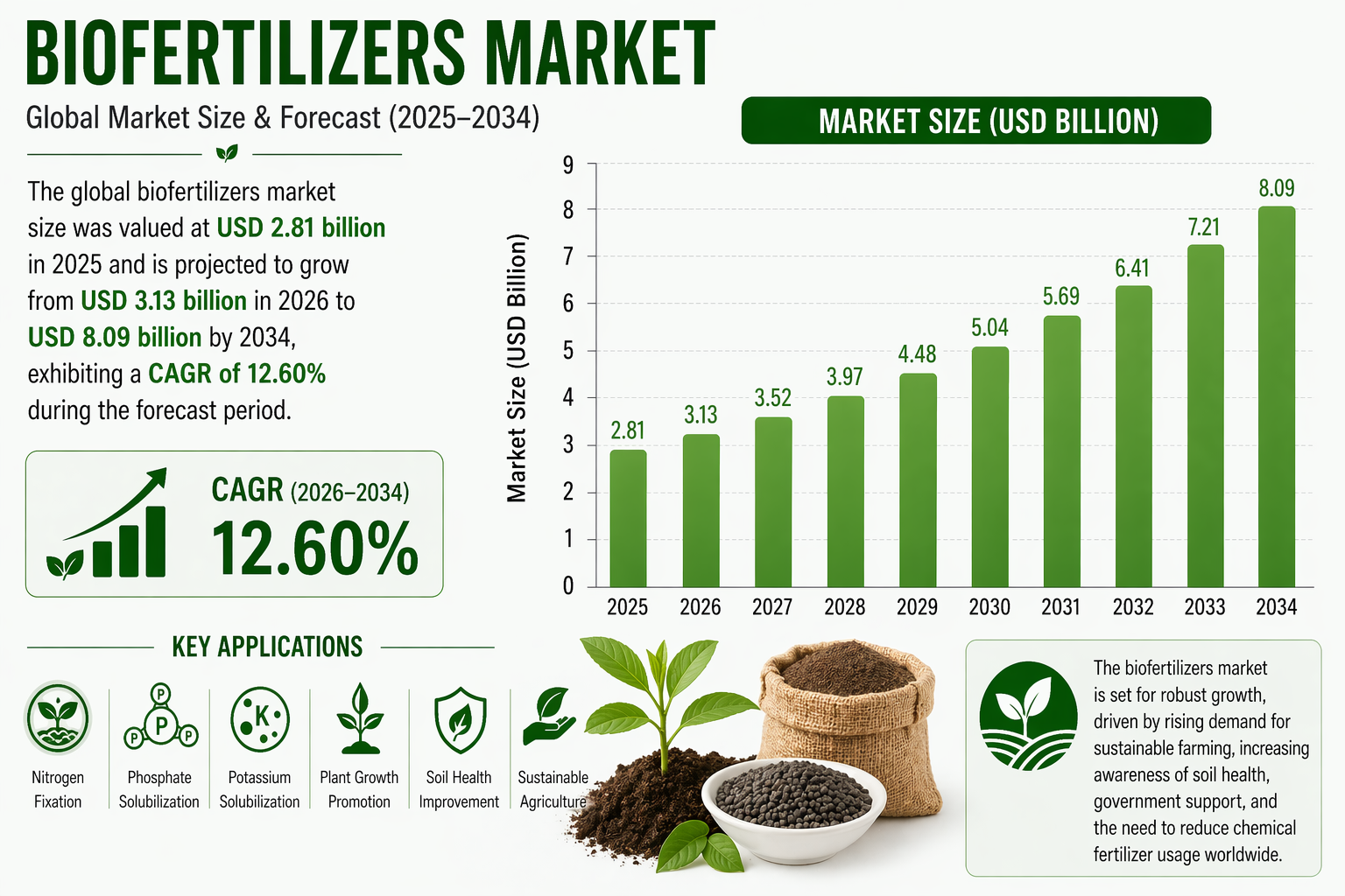 世界のバイオ肥料市場規模は、2025年には28億1000万米ドルと評価され、2026年の31億3000万米ドルから2034年には80億9000万米ドルに成長すると予測されており、予測期間中の年平均成長率(CAGR)は12.60%となる見込みです。