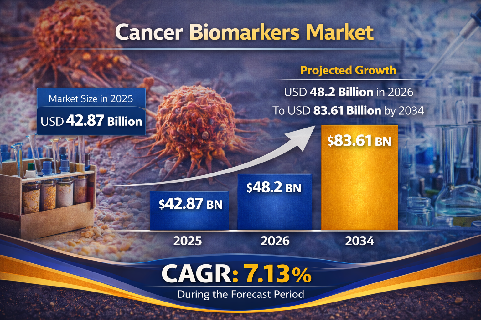 世界の癌バイオマーカー市場規模は、2025年には428億7000万米ドルと評価されました。2026年の482億米ドルから2034年には836億1000万米ドルに成長すると予測されており、予測期間中の年平均成長率(CAGR)は7.13%です。