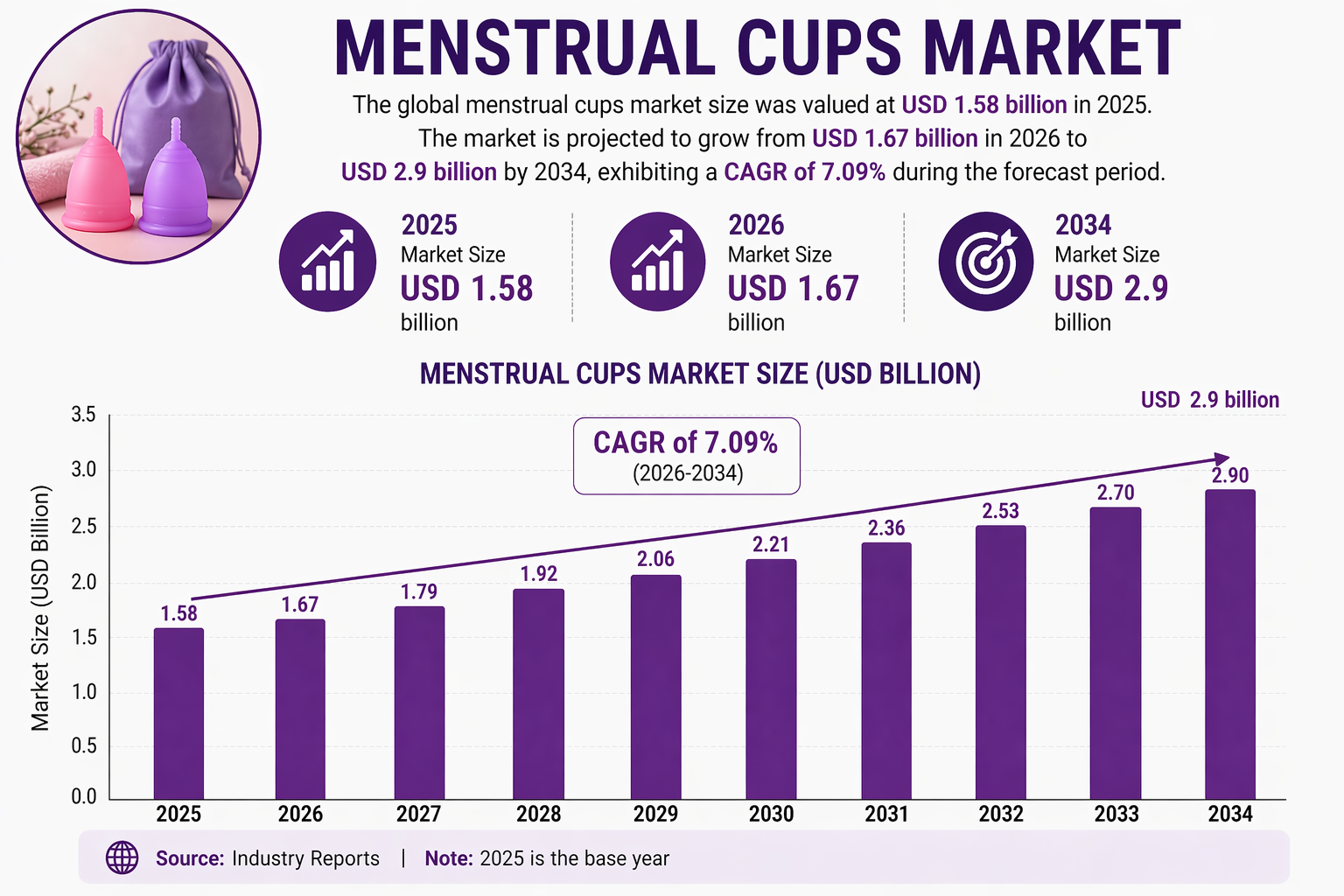 世界の月経カップ市場規模は、2025年には15億8000万米ドルと評価されました。同市場は、2026年の16億7000万米ドルから2034年には29億米ドルに成長すると予測されており、予測期間中の年平均成長率(CAGR)は7.09%です。