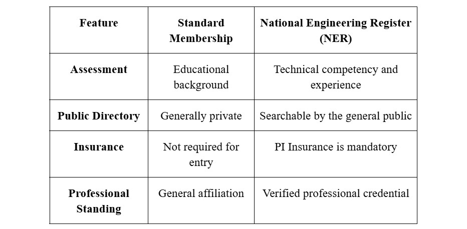 It is a common misconception that being a member of an engineering body is the same as being registered. Membership signifies affiliation, whereas the NER signifies a vetted level of professional competence.