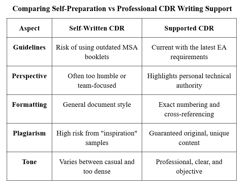 If you write "we," they might reject your application since they cannot see your individual contribution. Professional CDR Writers help shift that focus. They look at your project history and pull out the specific tasks, calculations, and decisions that belong to you alone.