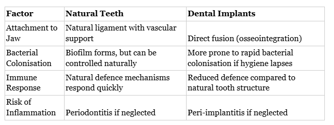 This table shows how implant success is closely tied to microbial control. Natural teeth offer more built-in defences, while implants require stricter long-term hygiene. This connection underscores the shared role of the patient and dentist in sustaining a healthy microbiome.