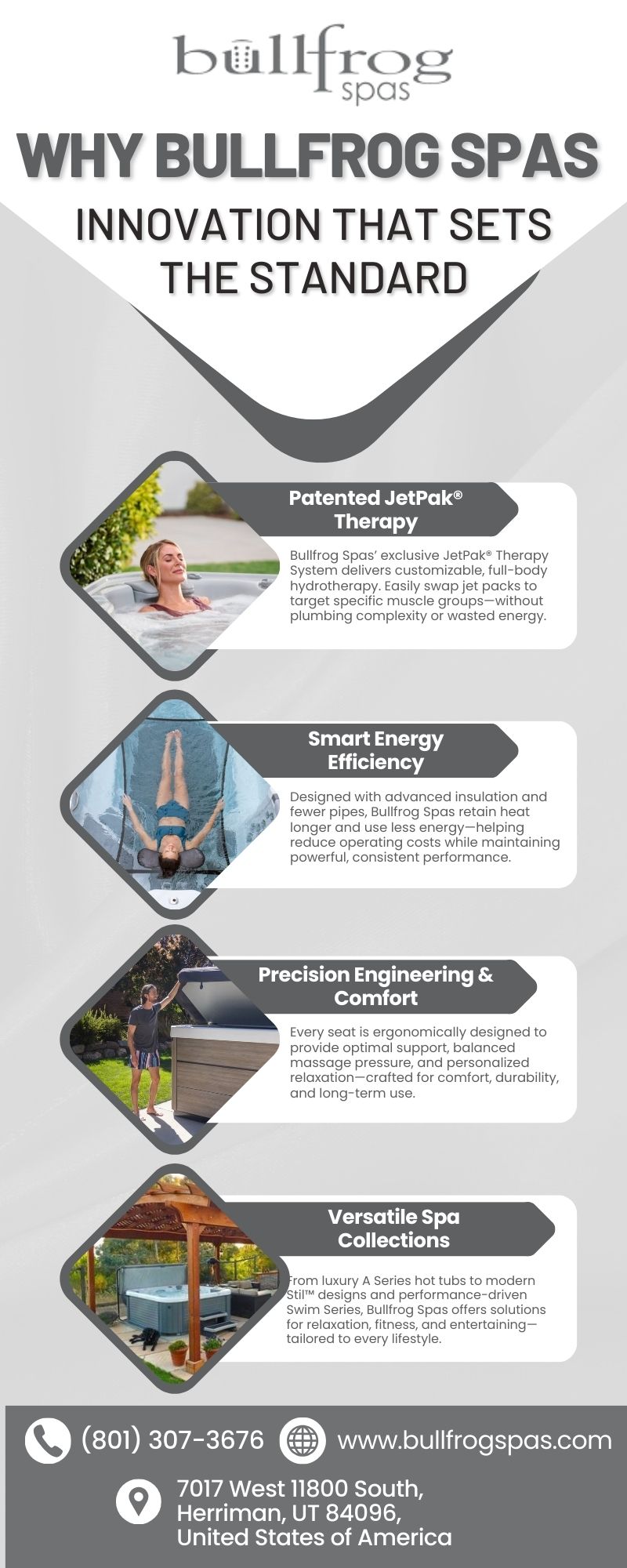 This infographic highlights why Bullfrog Spas is a leading choice in premium hot tubs and swim spas. It focuses on key decision-making factors such as powerful hydrotherapy, trusted customer reviews, reliable construction, and innovative spa technology. The content showcases Bullfrog’s commitment to performance, comfort, and long-term value, helping viewers understand what sets the brand apart when choosing the right hot tub for their lifestyle. For more information on Hot Tub Super Store, call us at (801) 565-8111.