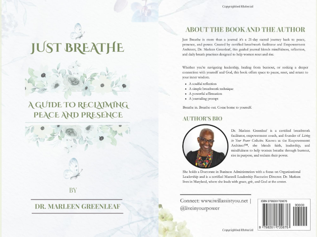 Waldorf, MD, January 13, 2026 -- In a world marked by constant demands, burnout, and emotional overload, Dr. Marleen Greenleaf, DBA, offers women a restorative invitation to slow down and return to themselves with her new book, Just Breathe: A Guide to Reclaiming Peace and Presence. More than a traditional journal, the book is a structured 21-day journey that blends breathwork, mindfulness, and spiritual reflection to support healing, clarity, and renewal.