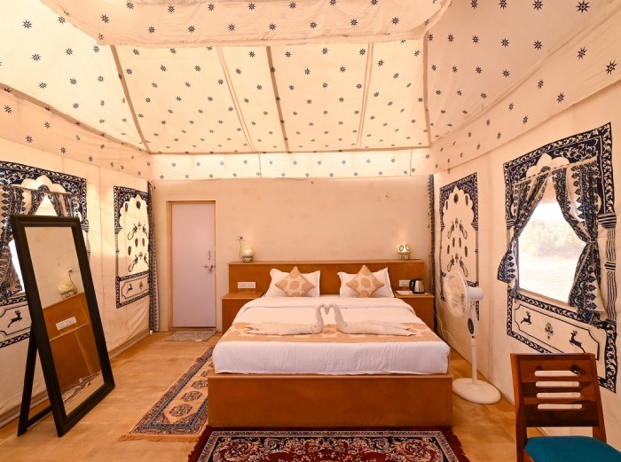The luxury tent in Jaisalmer is elegantly decorated with traditional Rajasthani furniture and intricate artwork, offering guests an authentic and sophisticated experience. The suites feature elaborate patterns and rich colors, providing an indulgent atmosphere for relaxation. King-size beds and luxurious bathrooms adorn each camp, guaranteeing complete comfort. Additionally, the camp boast beautiful views of the surrounding area, creating a tranquil and peaceful ambiance. Guests can enjoy a lavish stay while immersing themselves in the culture and nature without compromising on comfort.